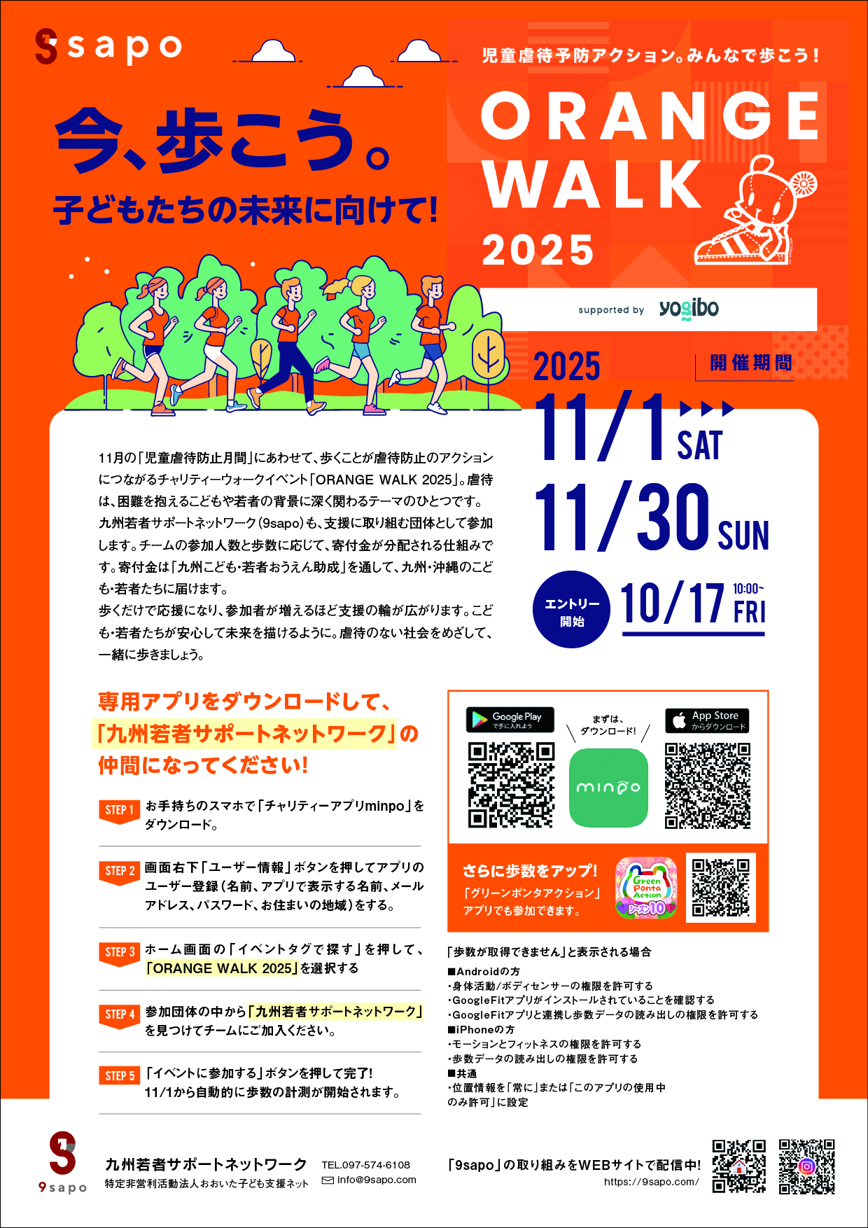 九州若者サポートネットワーク(9sapo)は、児童虐待防止推進月間の2025年11月1日(土)〜11月30日(日)に歩いて児童虐待防止に取り組む団体に寄付を届けるイベント【ORANGE WALK 2025(以下ORANGE WALK)】の支援先団体の一つとして選ばれました。九州若者サポートネットワーク(9sapo)を応援してくださる参加者を募集します。